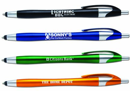 Fun and functional. Handy stylus tip and ultrasmooth writing. This pen/stylus combo has an ergonomic body that fits comfortably in your hand. Great promotional give-away for conferences, tradeshows, educational events and schools. Metallic Color Barrel, Silver Accent: Black, Green, Blue, Red or Orange.Available with medium point, Black or Blue ink. Price includes one standard color on barrel.